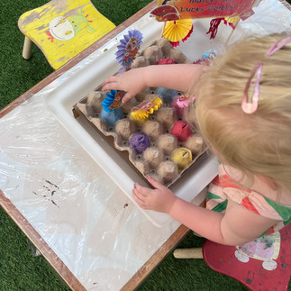 Buiten is er ruimte om te knutselen of te verven. Ook hebben ze glijbanen, huisjes om in te spelen, sensorisch speelgoed en educatieve activiteiten die ze afstemmen op de dagen van de week of festiviteiten. Wij hadden bijvoorbeeld Chinees nieuwjaar.